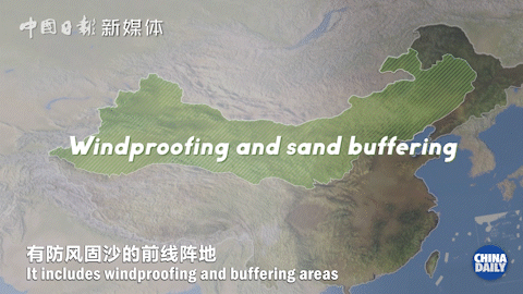 It includes windproofing and buffering areas such as the Three-North Shelterbelt, which reduced the frequency of sandstorms from 5.1 to 0.1 days per year in the Beijing-Tianjin-Hebei region from 1978 to 2015.