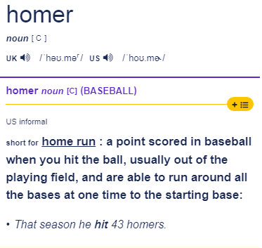 《剑桥词典》11月16日发布新闻称,“Homer”是非正式美式英语术语,指棒球全垒打。它还是动画《辛普森一家》中的某个角色名,以及一位古希腊诗人的名字。