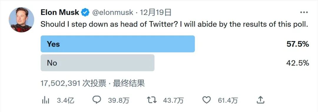 没想到戏还没演完,自己又栽了跟头。马斯克周一在推特上又利用自己最爱的投票功能,让大家决定是否让自己继续担任推特CEO,结果把自己给选下了台。美国言论自由的根本在于谁是掌握话语权的人,这样的闹剧,可休矣。