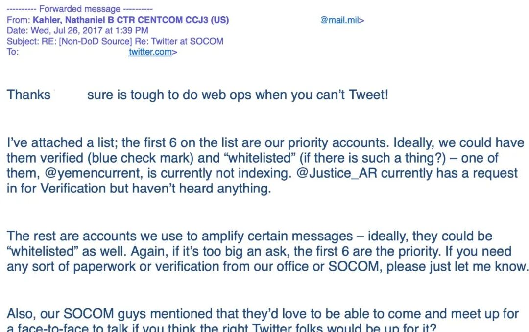 2017年,美国中央司令部一位官员发送给推特的邮件,要求对相关账户进行豁免