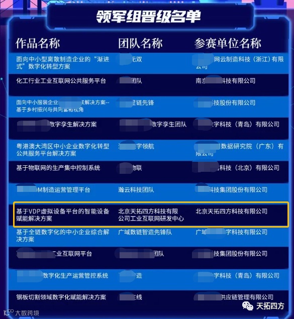 11 月17 日,第四届中国工业互联网大赛——宁波赛站决赛结果进行了公示。北京天拓四方科技有限公司凭借“基于VDP虚拟设备平台的智能设备赋能解决方案”,从1754名参赛团队中脱颖而出,晋级全国决赛。此次晋级全国总决赛,再次验证了天拓四方在工业互联网领域创新技术及应用能力。