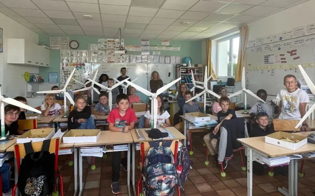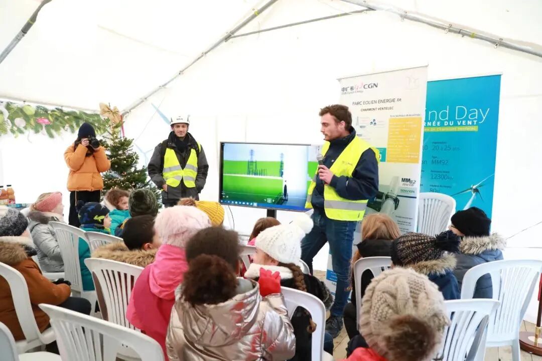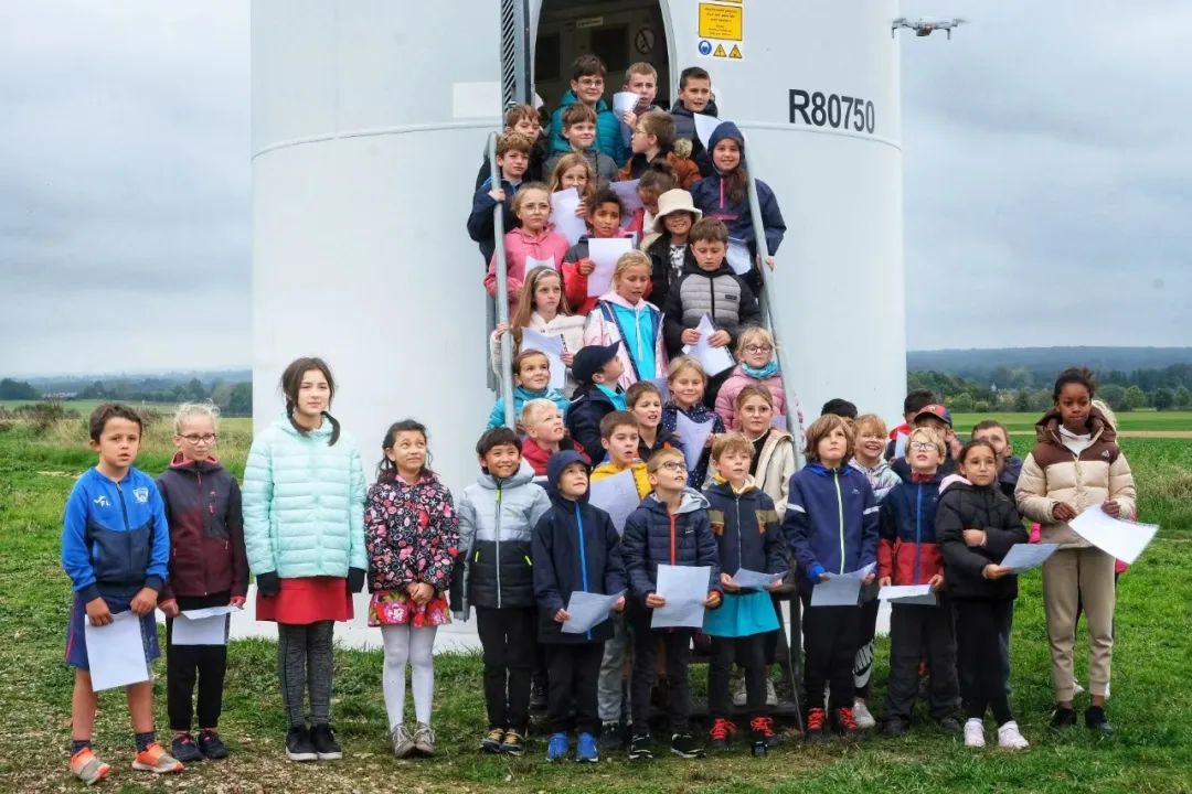 近日,在法国诺曼底Falaise风电场举办的开放日活动中,来自佩兰园小学的40余名小学生现场参观了风机,学习了清洁能源知识,并共同演唱了在中国深受欢迎的歌曲《孤勇者》。