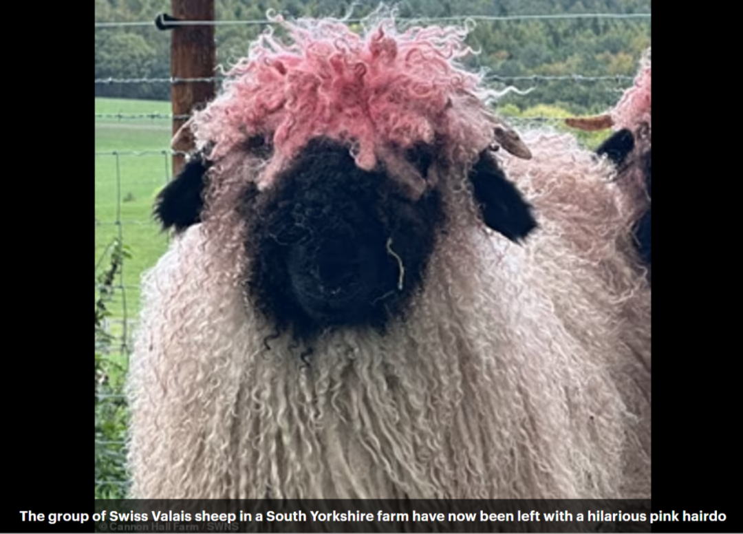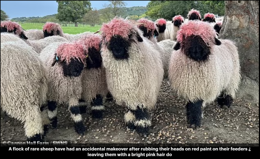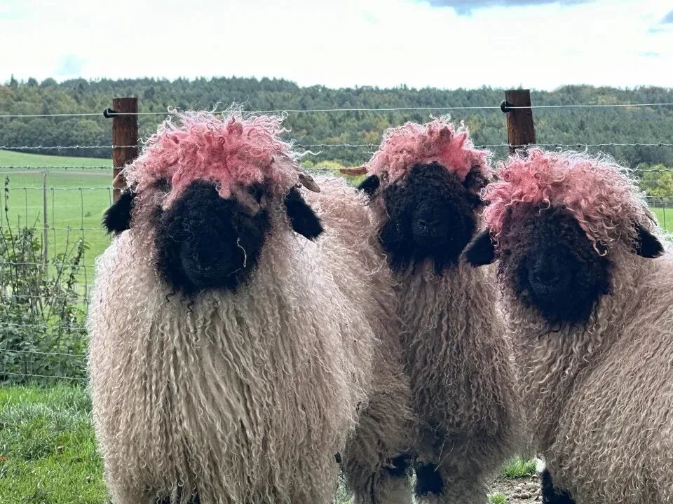 Hilarious photos show the group of Swiss Valais sheep, which should have white heads and black faces, with the shock hair style. They have now been left with a pink hairdo, and snaps taken by staff at the farm show the sheep stood in their pen showing off their new look.
