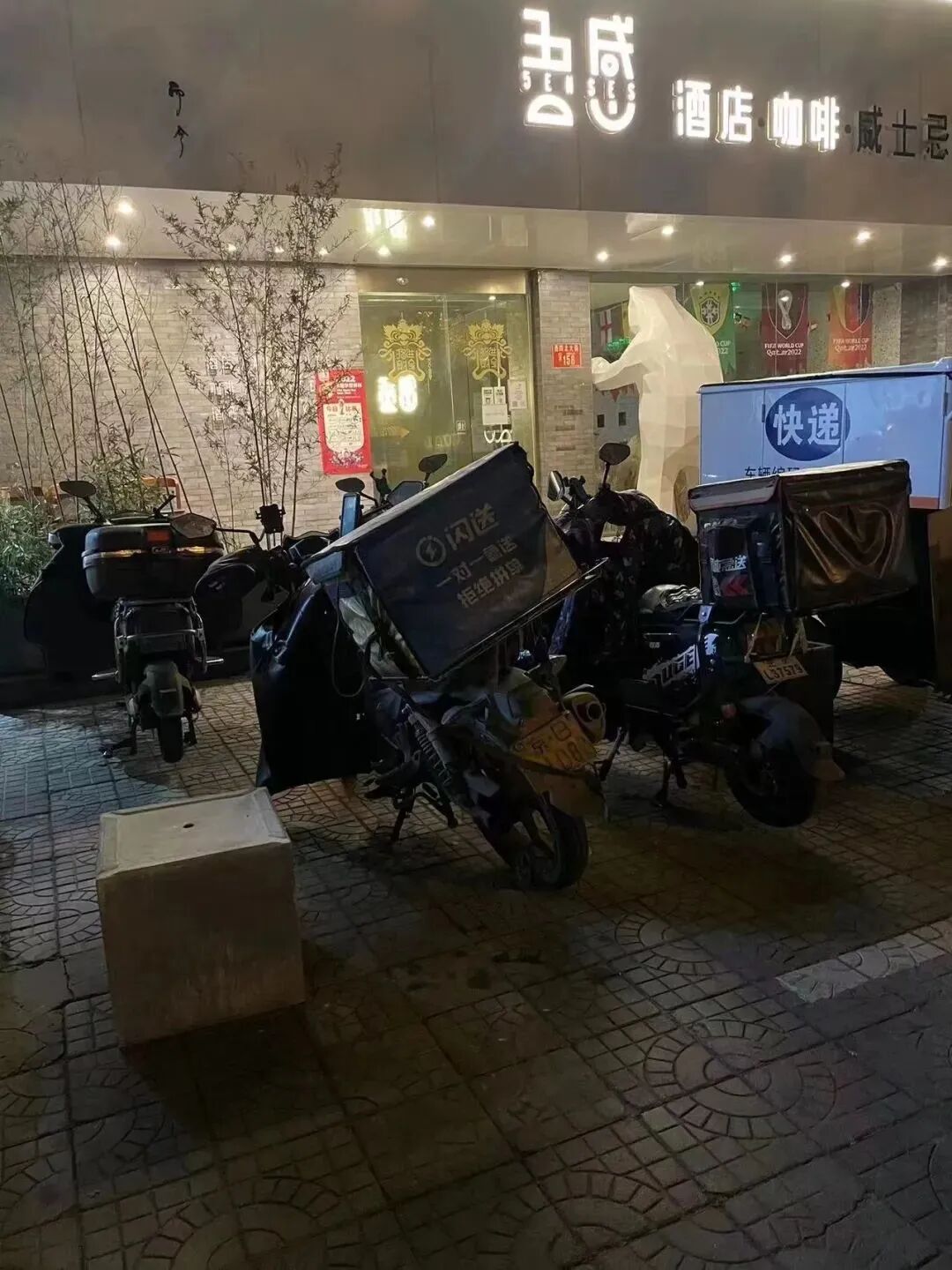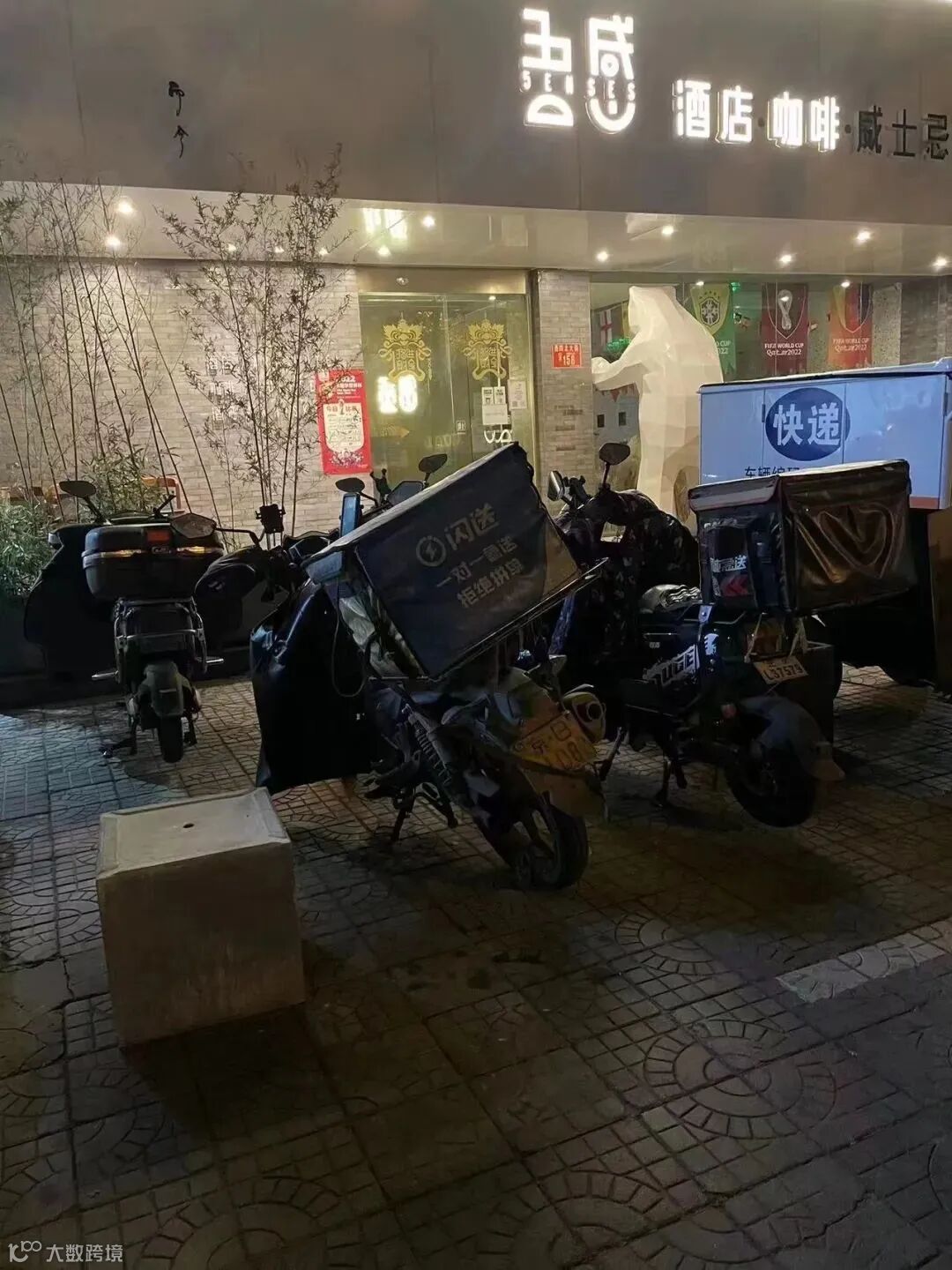 深夜,快递小哥的快递车停在酒店门口 图源:中国日报