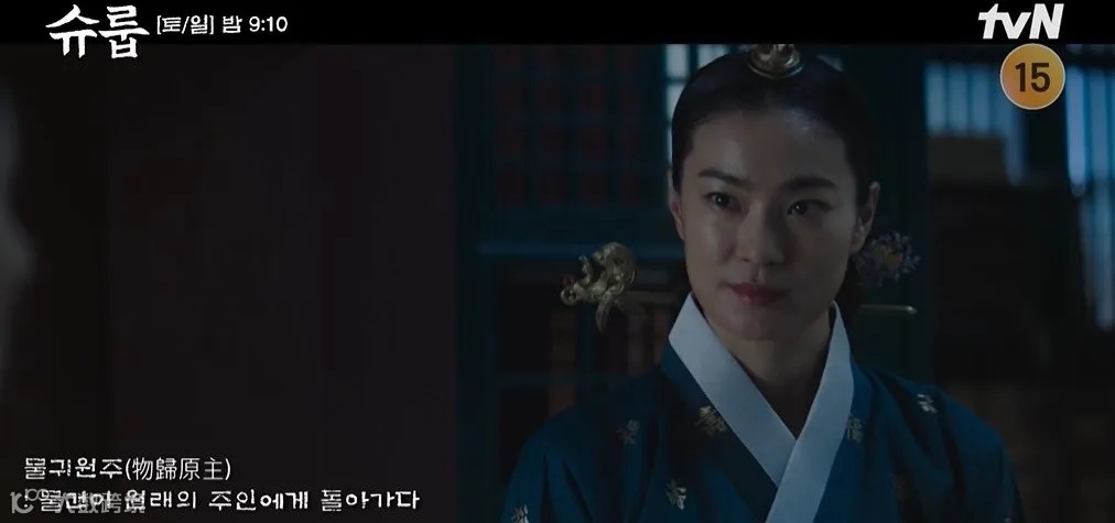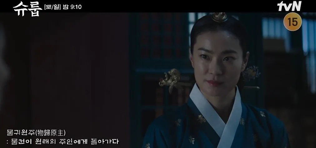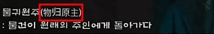 The “Mul Gwi Won Ju” that appeared in this scene was written as “物归原主”, not “物歸原主”. This is a caption based on the Chinese notation of this phrase.
