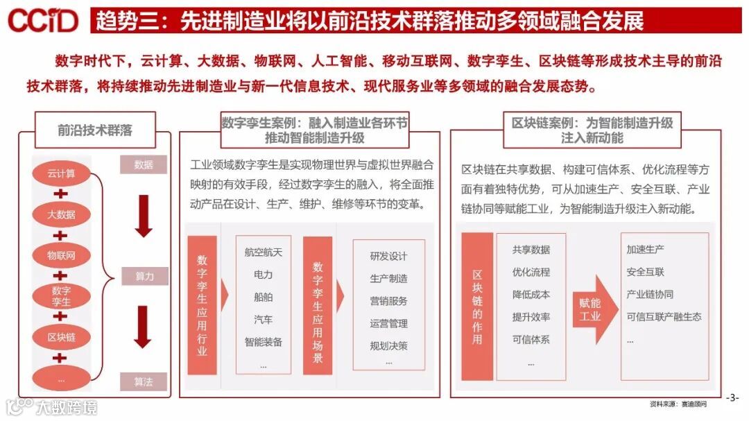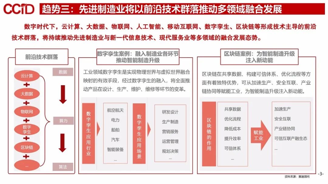 当前新一代信息技术与先进制造技术深度融合,贯穿于先进制造业的各个环节,数字孪生、人工智能、移动互联网、区块链等形成的前沿技术群落,将持续推动先进制造业与新一代信息技术、现代服务业等多领域的融合发展。