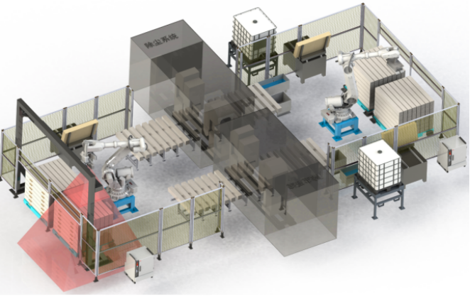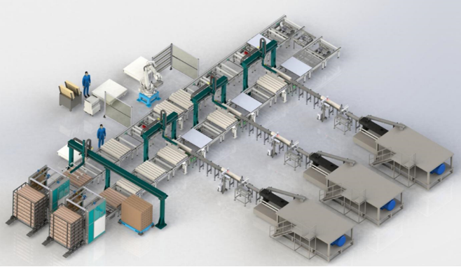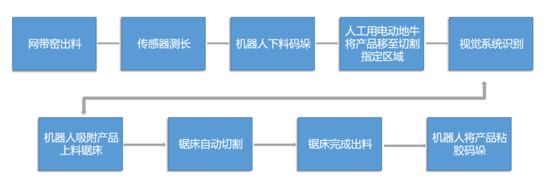 生产线主要实现的功能包括:在线自动测产品的长度;在线自动剪切,人工检测故障回流工位;在线自动打码;在线自动双工位定位;在线自动上托盘;在线自动托盘内摆料;在线自动上托盘上盖;在线自动托盘码垛;在线自动拆垛;在线自动拆托盘下盖,机器人自动下料;在线自动拆托盘。