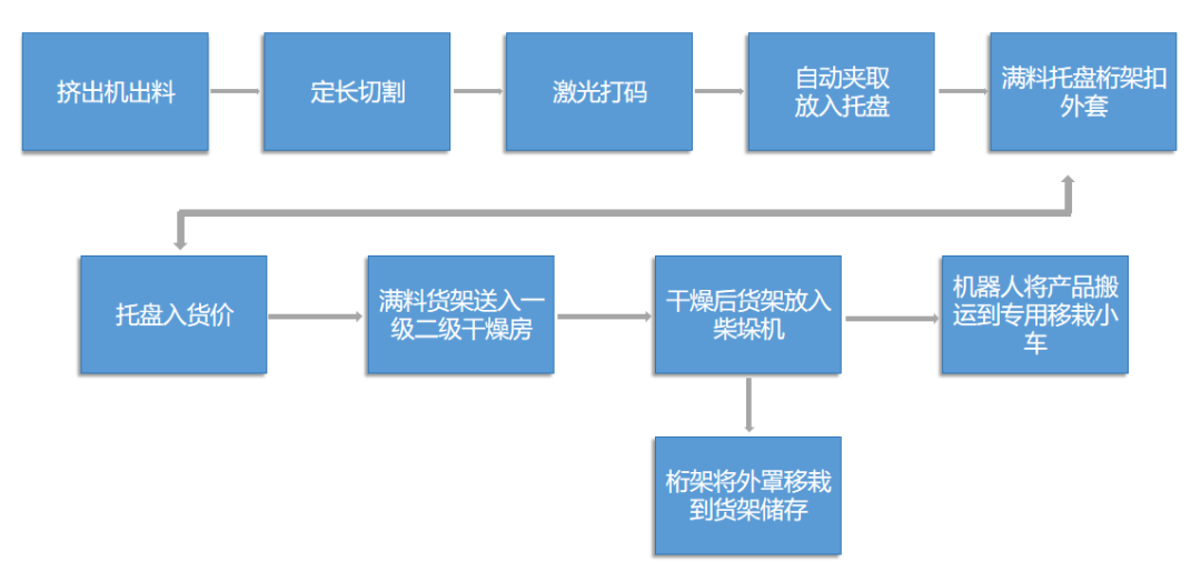 合格的产品通过切割打码后自动输送至桁架机器手抓取位置,经桁架机器手码放到托盘上,再经桁架机器手实现自动上盖,上盖完成后自动输送到托盘上架系统,经托盘上架系统自动装入一级干燥车,一级干燥车采用定位系统进行定位,当一级干燥车装满后采用人工或叉车送到一级干燥室中;