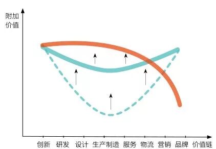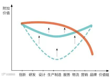 1992年台湾宏基创始人施振荣为“再造宏基”提出了著名的“微笑曲线”(Smiling Curve)理论,也称附加值理论。微笑曲线中间是制造,左边是研发,右边是营销。企业向价值链的上下游延伸,向上延伸使得企业进入到基础产业环节或技术研发环节,向下游拓展则进入到市场销售环节。简言之,微笑曲线是以附加值的高低看待企业竞争力。企业只有不断往附加值高的研发与营销方向移动和定位,才能永续运营。因此,未来企业应朝微笑曲线的两端发展,也就是加强研发与设计以及以客户为导向的营销与服务,才能争取竞争的主动,扩大附加价值与利润空间。