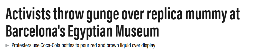 两名气候活动家将可口可乐瓶中的红褐色粘稠液体泼洒到了木乃伊复制展品的展示柜及墙面的画像上。据猜测,泼洒的液体可能是糖浆和甜菜根汁。
