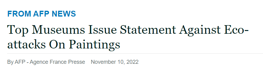 Recently, more than 90 museum leaders signed a letter decrying the actions of the eco-activists, saying that the protestors “severely underestimate the fragility” of the art works they are targeting.