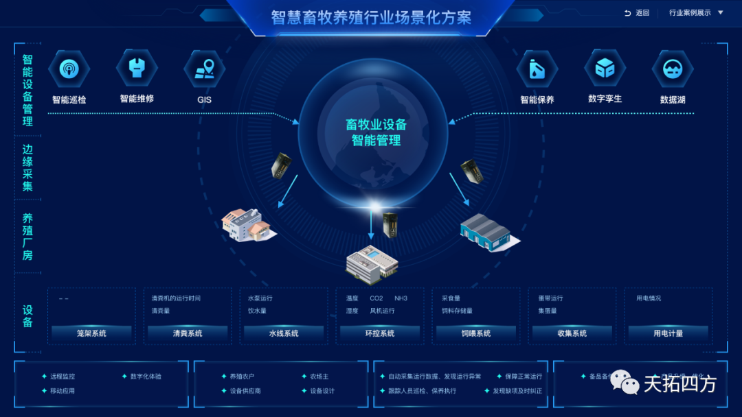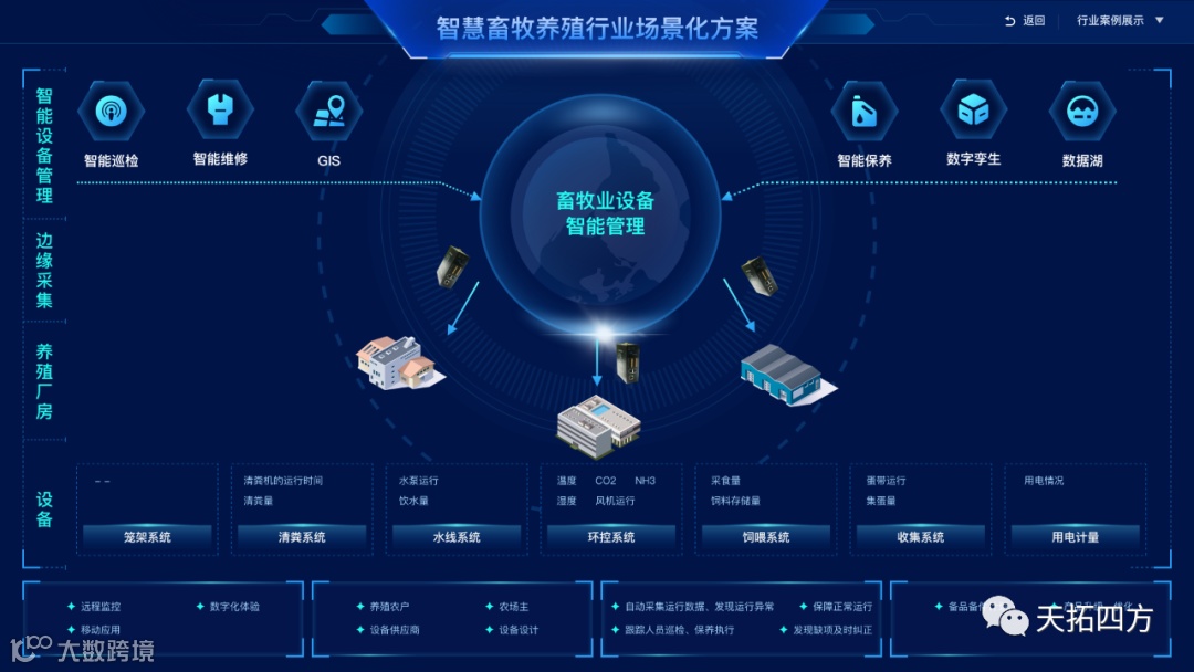 为促进畜牧业高质量发展,准确、实时掌握区域内畜禽生产动态,加强动物防疫工作信息化管理,提高畜牧信息化管理水平,形成动物及动物产品来源可溯、去向可查、责任可究的质量安全追溯体系,作为专业的数字化工厂和工业互联网DEPC(数字化业务总服务商),天拓四方全力推动智慧畜牧业发展,为乡村振兴发力。