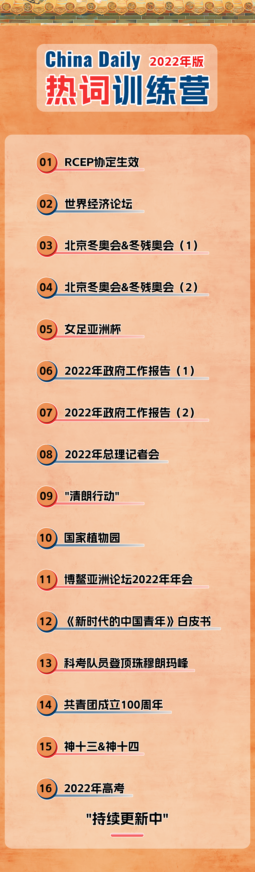 自2019年上线后,《China Daily热词训练营》每年更新,紧跟时政热点,为读者提供及时、新鲜、权威的中国特色词汇课程。