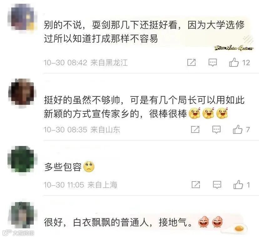 在10月27日发布的《解局长带你游随州-第19集》短视频里,解伟身着白衣,头戴发冠,在银杏落叶中舞剑饮酒,氛围唯美。然而,评论却不怎么“给面子”,纷纷吐槽造型粗糙,亦有评论称解局长体形宽大,没有侠客飘飘欲仙、逍遥洒脱之风,不适合做此扮相,有人甚至直言“没有颜值不必强求”。