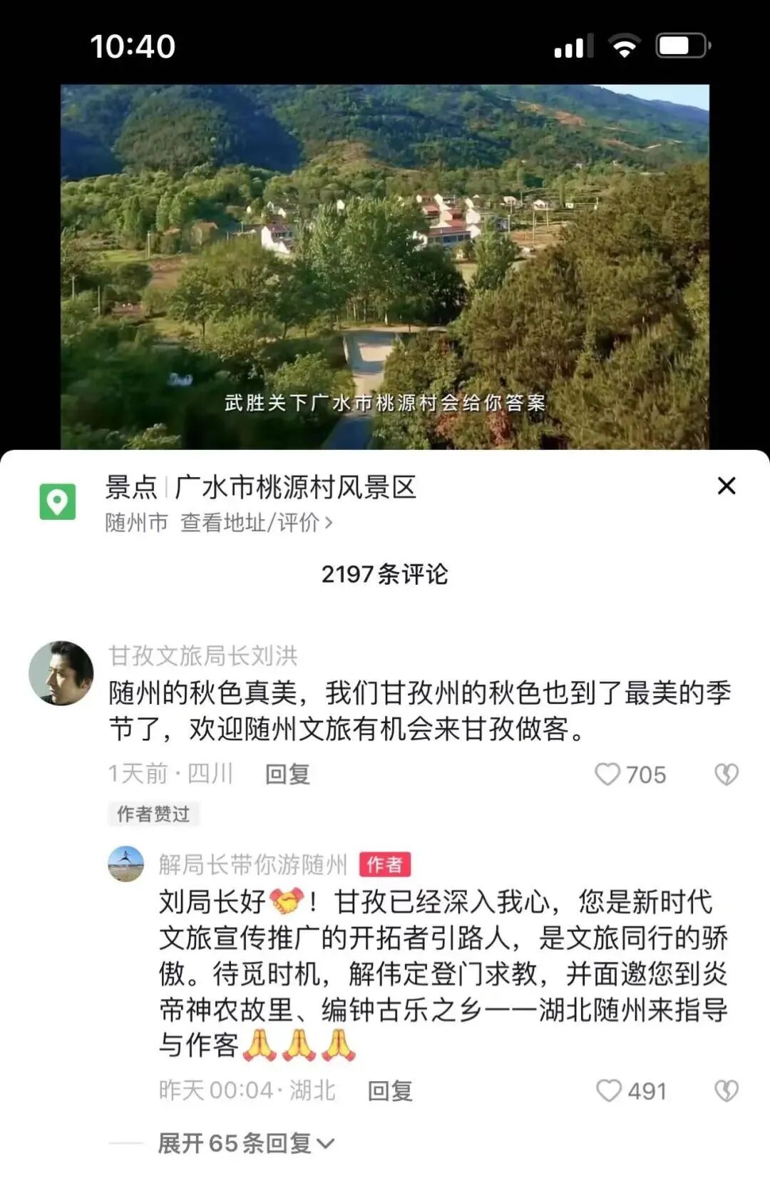 Liu Hong, director of the cultural and tourism bureau of Ganzi Tibetan autonomous prefecture, Sichuan province, commented on the video posted by Xie Wei last Saturday, praising Suizhou's beautiful scenery and inviting Xie to visit Ganzi in the future.