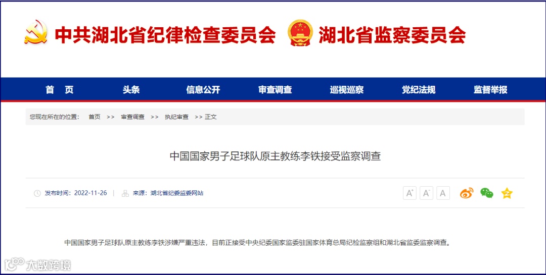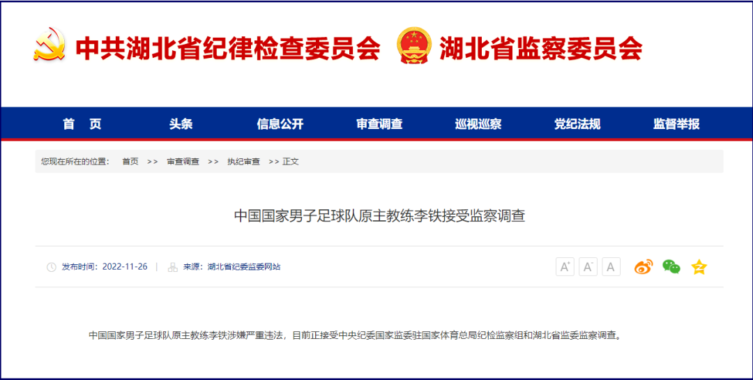 Li Tie, former head coach of the Chinese men's football team, is under investigation for suspected serious violations of the law.