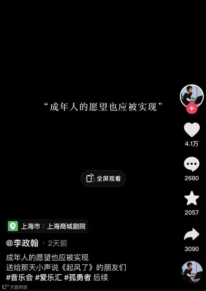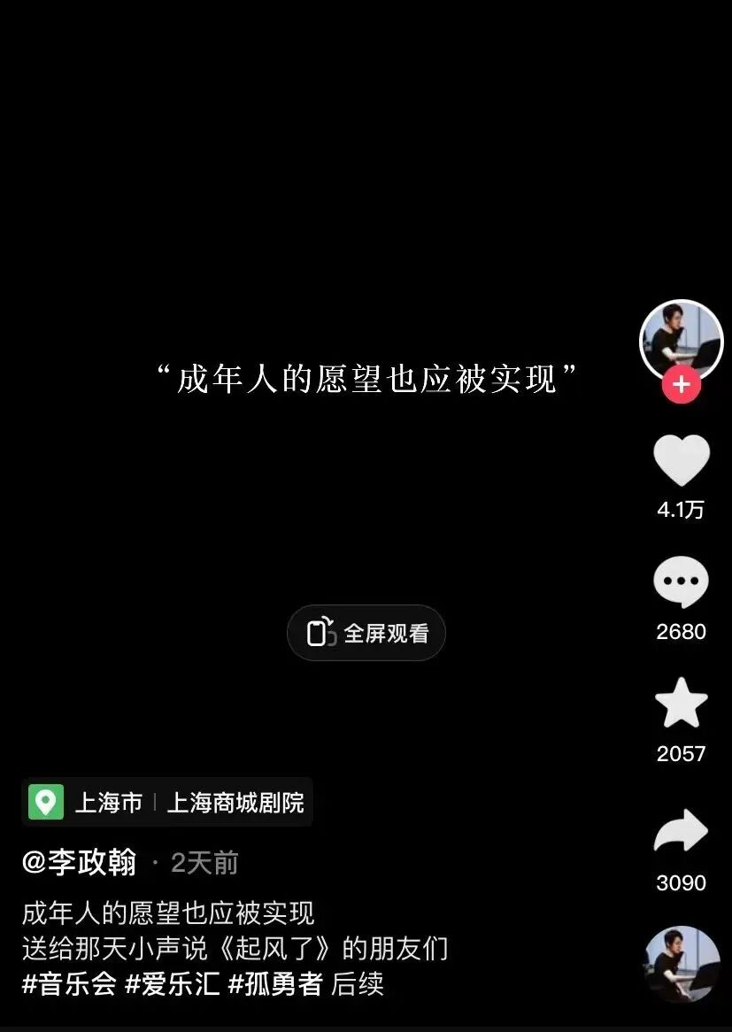 除此之外,大朋友的点歌也被听到了。18日,李政翰在个人账号上分享了乐团演奏《起风了》的视频,并且配文了“成年人的愿望也应该被实现,送给那天小声说《起风了》的朋友们”。