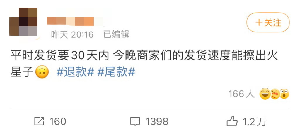 但和往年不同的是,今年“退款”成为了热词,登上了微博热搜。原因是商家发货的速度实在是太快,买家刚下完单就发现已经发货了,丝毫不给退款的机会。