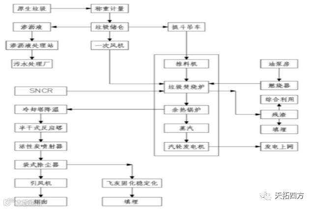 垃圾焚烧发电,是目前普遍采用的固废处理和资源化利用的有效方法,消减固废,产生的电能并网供生活生产使用,变废为宝。此法主要采用炉排炉工艺如下图所示: