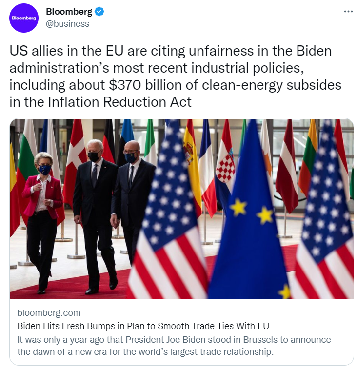 US allies in the EU are citing unfairness in the Biden administration’s most recent industrial policies, including about $370 billion of clean-energy subsides in the Inflation Reduction Act.