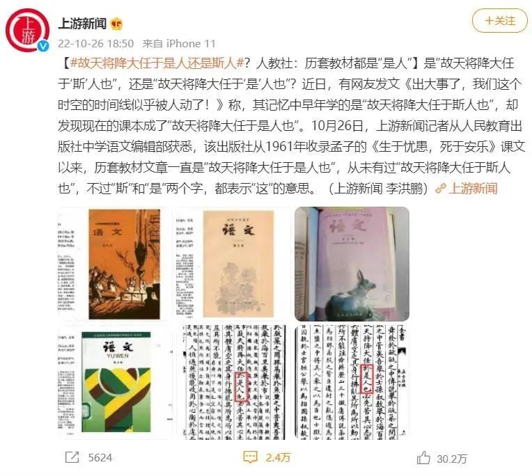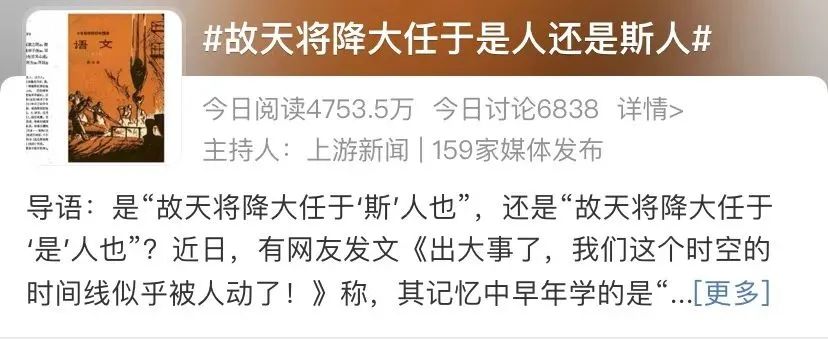 你还记得,上学时候的课本里孟子的《生于忧患,死于安乐》,其中的名句是“故天将降大任于‘斯’人也”,还是“故天将降大任于‘是’人也”?最近,这个话题引发了网友们的兴趣。