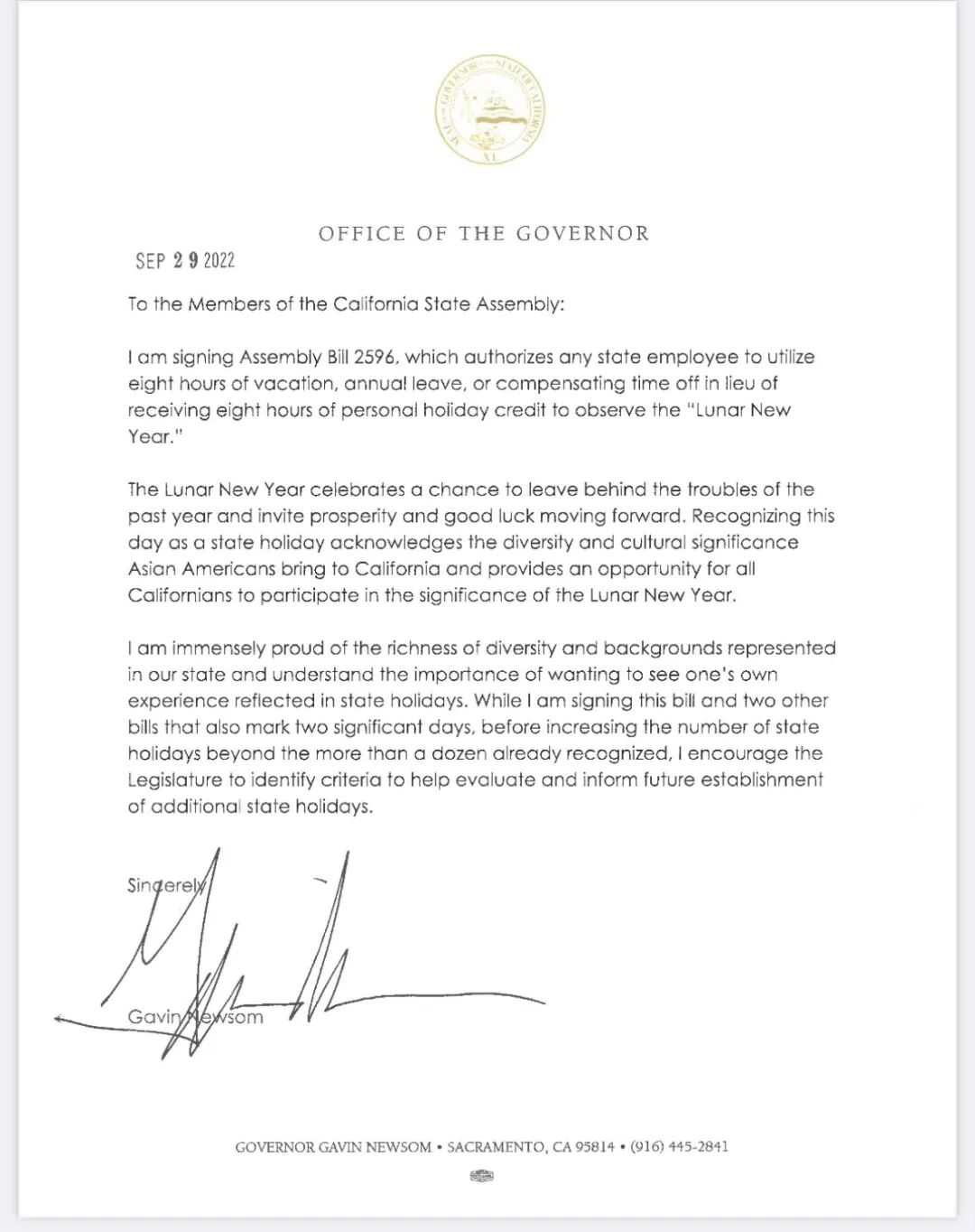 纽瑟姆在签名信中写道:农历新年庆祝摆脱过去一年的烦恼,并迎接繁荣和好运继续前行,承认农历新年为加州的法定假日,也是承认亚裔给加州带来的多样性文化,为所有加州人提供了一个参与度过农历新年的机会。