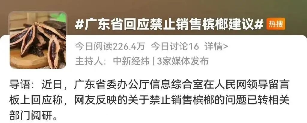 近日,广东省回应网友建议禁止销售槟榔上了热搜。广东省委办公厅信息综合室在人民网领导留言板上回应称,网友反映的关于禁止销售槟榔的问题已转相关部门阅研。