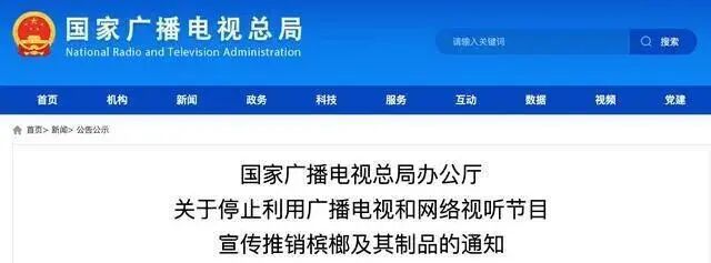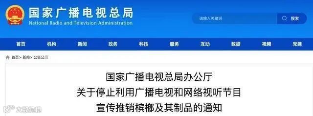 2019年3月7日,湖南省槟榔食品行业协会发布通知,要求所有槟榔企业即日起停止国内全部广告宣传,且必须在3月15日前全部完成此项工作。2021年9月17日,国家广播电视总局办公厅发布通知,要求停止利用广播电视和网络视听节目宣传推销槟榔及其制品。