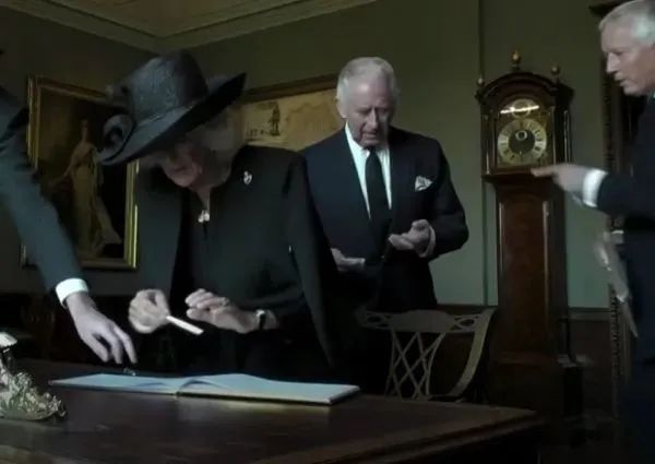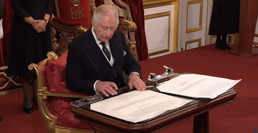 "Oh god I hate this (pen)!" Charles said, standing up and handing the pen to his wife, Camilla, Queen Consort.