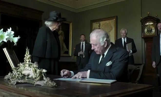 The new monarch was shown signing a visitor's book in front of cameras at Hillsborough Castle, near Belfast. He reacted after the pen he was using leaked on him.