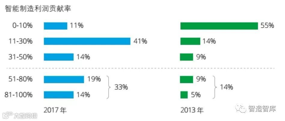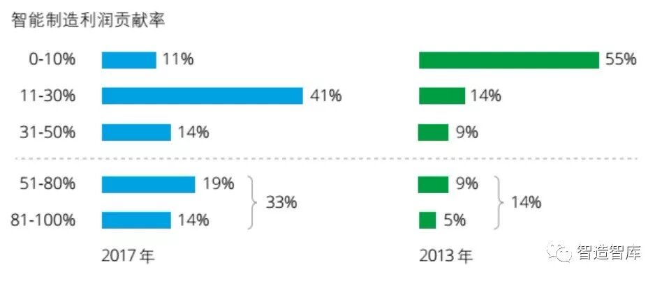 2013年智能制造为企业带来的利润并不明显,55%的受访企业其智能制造产品和服务净利润贡献率处于0-10%的区间,而2017年,仅有11%的受访企业处于这个区间,而41%的企业其智能制造利润贡献率在11-30%之间。利润贡献率超过50%的企业,由2013年受访企业占比14%提升到2017年的33%。智能制造利润贡献率明显提升,利润来源包括生产过程中效率的提升和产品服务价值的提升。