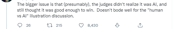 或许更大的问题是,裁判没有意识到这是人工智能,却仍然认为它足够好,可以赢得比赛。这对人类和人工智能在插图方面比拼的讨论来说可不是个好兆头。