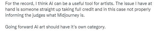 慎重声明,我认为人工智能对艺术家来说是一个有用的工具。我认为现在面临的问题是,有人直接把全部功劳揽在自己身上,而没有适时告知评委Midjourney是什么。未来的AI艺术应该有自己的类别。