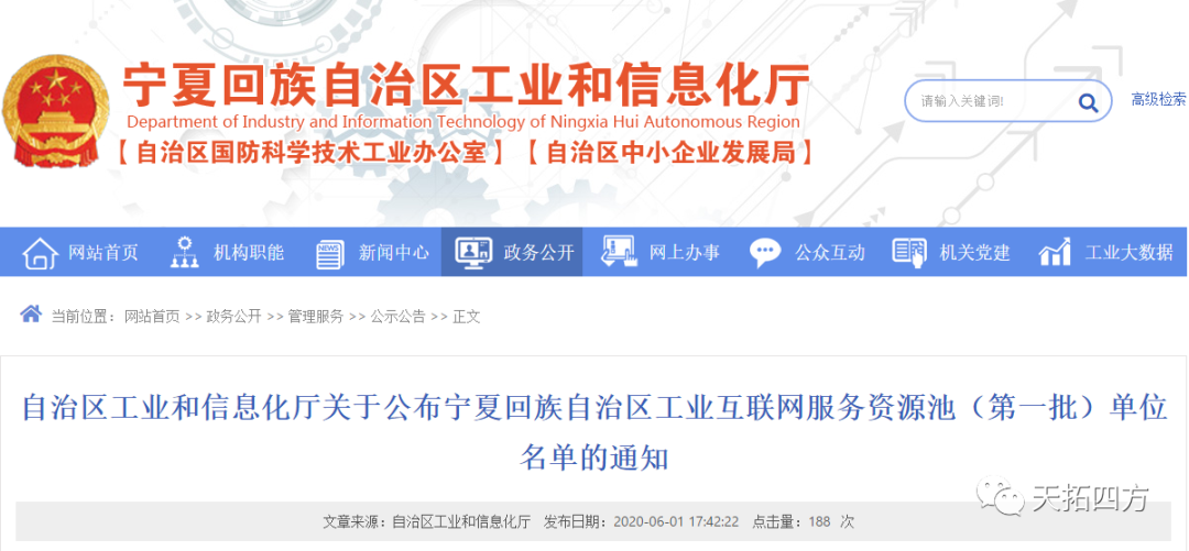 近日,宁夏回族自治区工业和信息化厅发布了宁夏工业互联网服务资源池(第一批)名单,经过申报、专家评审、综合审核、公开公示等程序,天拓四方成功入选宁夏工业互联网服务资源池。