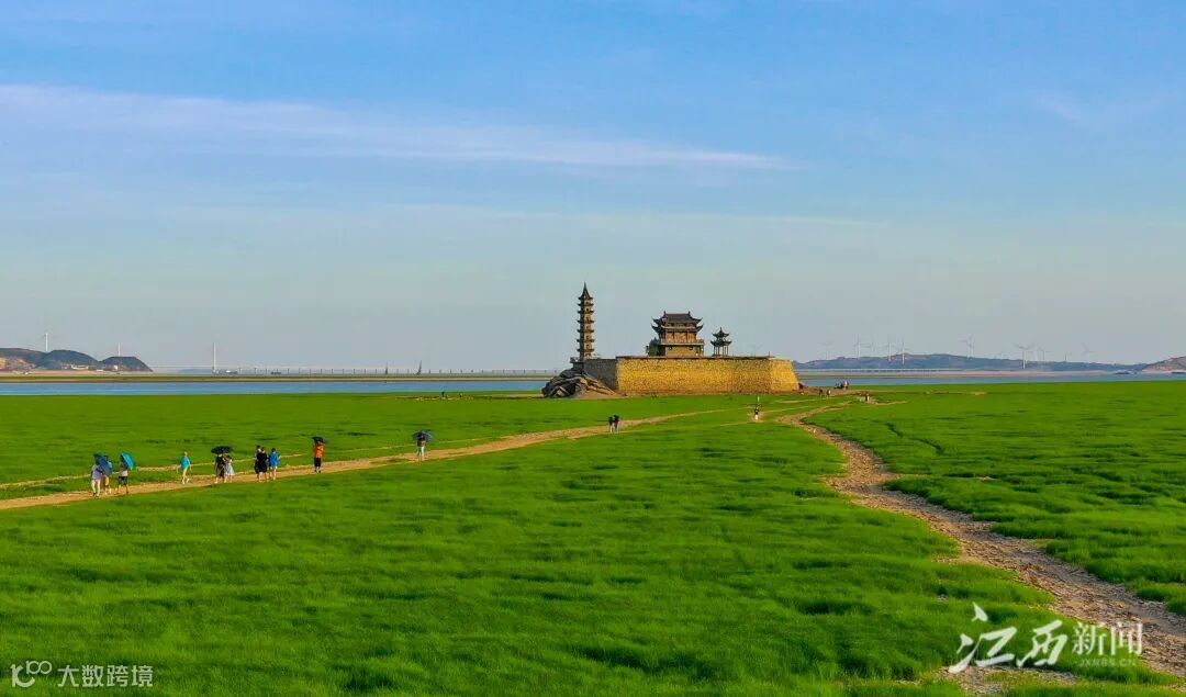 8月10日,南昌市新建区南矶乡,航拍镜头下的鄱阳湖,水位下降大片湖面变身绿洲,往年秋冬季才能一见的“鄱阳湖大草原”场景提前出现。图源:东方IC