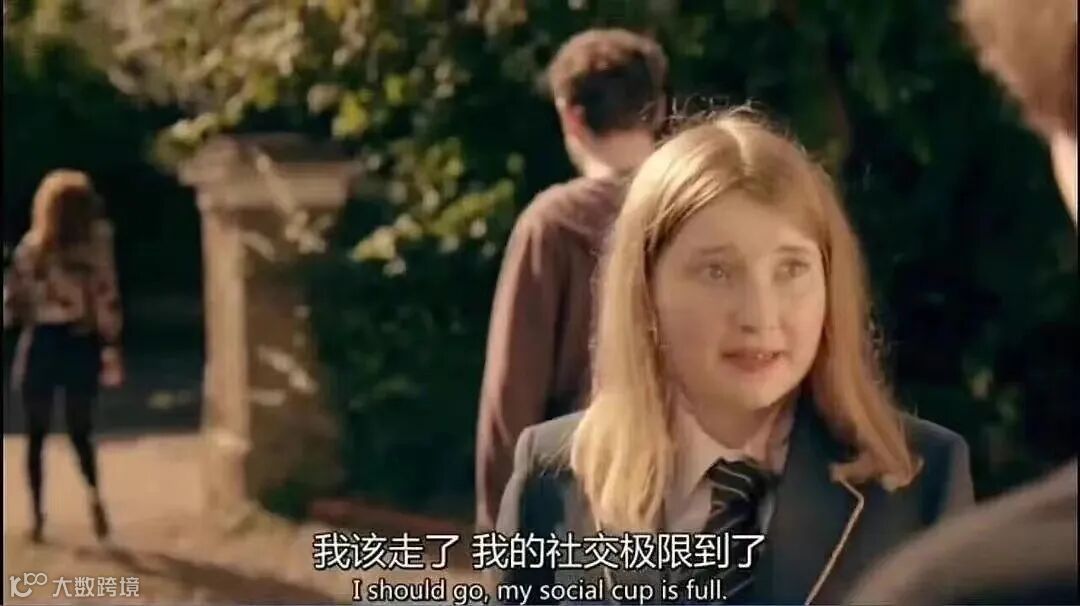 ✔ 电影台词中用 social cup 来表示社交能力,非常生动。形容盛社交能力的杯子已经满了,不够用了。