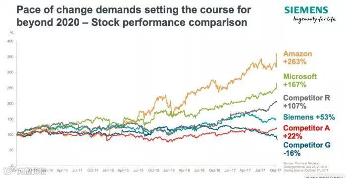 与大部分公司不同,西门子2017财年指2016年10月1日至2017年9月30日。这期间,西门子市值增长了14.4%至1192亿欧元。实体业务(Industrial Business)利润额同比增长8%,达95亿欧元。楼宇科技集团、数字化工厂集团、交通集团和过程工业与驱动集团均实现两位数的增长,抵消了发电与天然气集团以及西门子歌美飒业绩下降所带来的不利影响,并实现盈余。