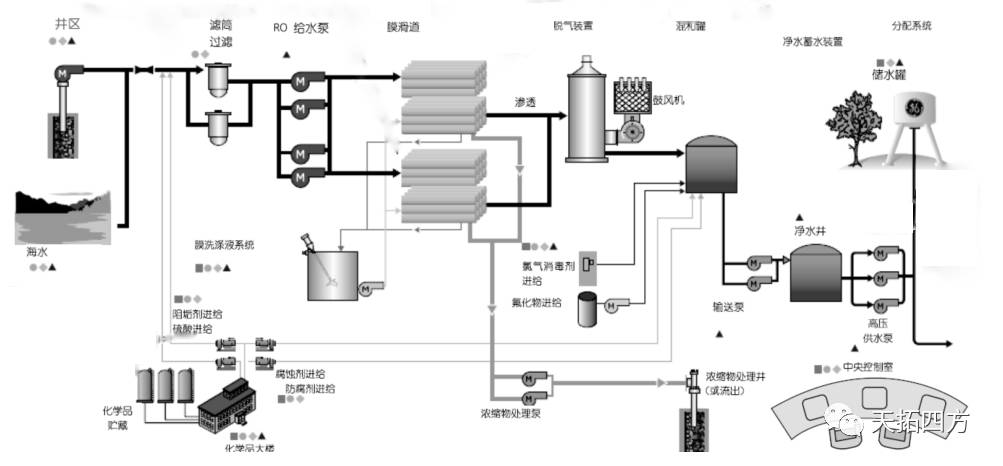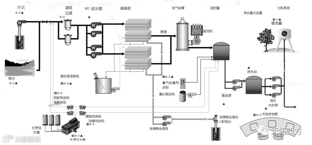 海水淡化即利用海水脱盐生产淡水。是实现水资源利用的开源增量技术,可以增加淡水总量,且不受时空和气候影响,可以保障沿海居民饮用水和工业锅炉补水等稳定供水,从海水中取得淡水的过程叫海水淡化。工艺流程如下: