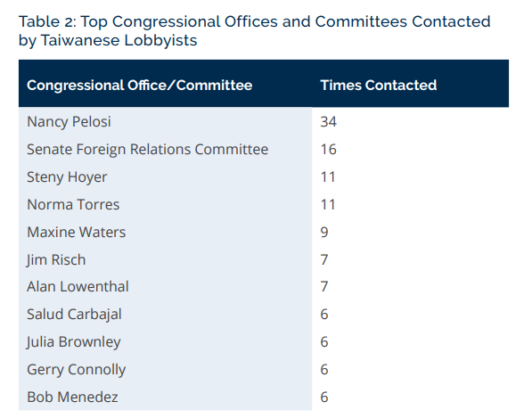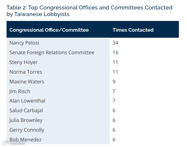 此外,这些受雇于台湾当局的游说公司在一年内赞助了143场竞选活动,佩洛西接受的政治献金数额名列前三。