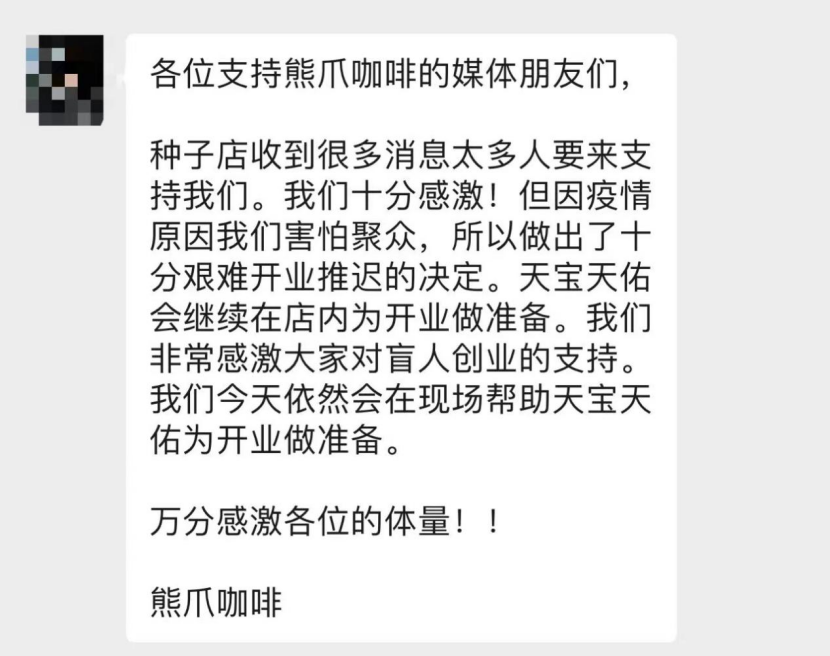 联合创始人王湉解释说:“我们收到了许多关心残疾人的组织和社会公益组织等发来的消息,他们都准备来到开业现场,亲自支持盲人咖啡师殷天保和殷天佑。初步统计下来,约有2000人将赶赴开业。”