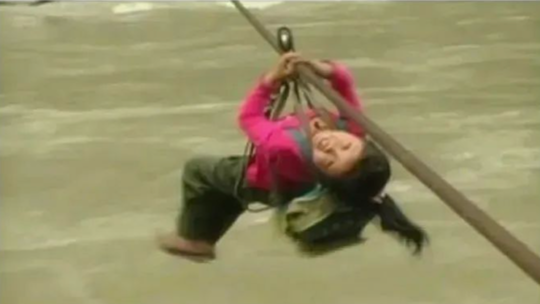 Like other people living here, the 8-year-old girl and her fellow students had to use a pulley to cross the river down a steel cable to get to school every day.