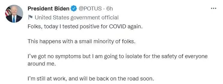 奥康纳在一份致白宫的备忘录中说,拜登当天上午接受新冠病毒抗原检测,结果呈阳性。拜登没有再次出现感染症状、感觉良好,目前不用恢复治疗,但需要继续观察并重新进入隔离。