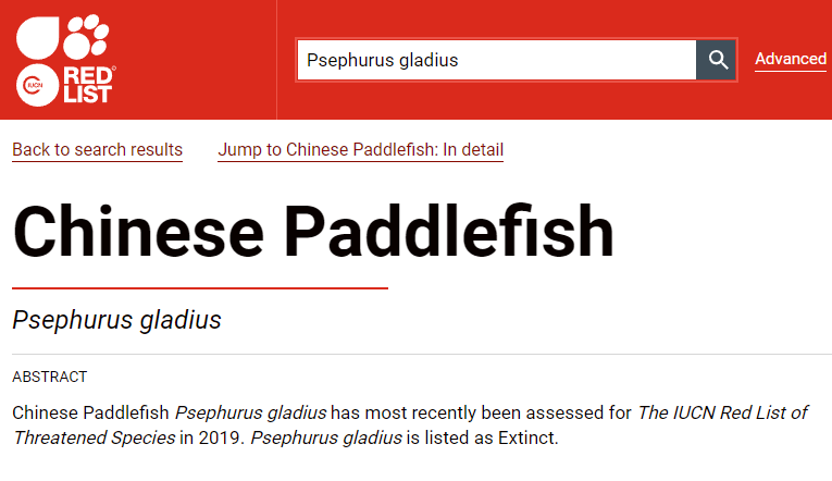 The reassessment has also confirmed the extinction of the Chinese paddlefish (Psephurus gladius) and that the Yangtze Sturgeon (Acipenser dabryanus) has moved, from critically endangered, to extinct in the wild.