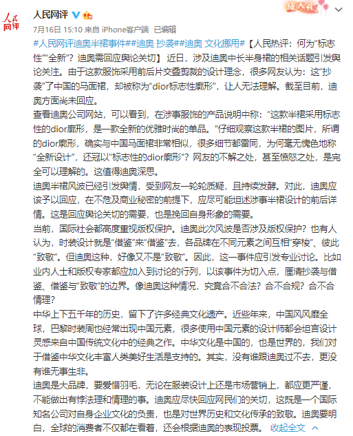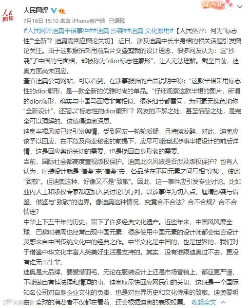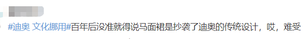 宏观来看,类似的参考在时尚圈较为常见,迪奥历史上的多位设计师也曾对中国元素有过借鉴。不过大部分网友指出,其问题在于,迪奥官网在涉事服饰的产品说明中称:这款半裙采用标志性的Dior廓形,是一款全新的优雅时尚的单品。