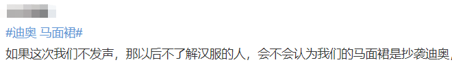 Hanfu lovers highlighted that they deemed Dior's new collection as a copycat as it had high split on the front and back, folds on both sides as well as the design in the waist, which are all typical elements of a horse face skirt, while Dior insisted it was an original design.