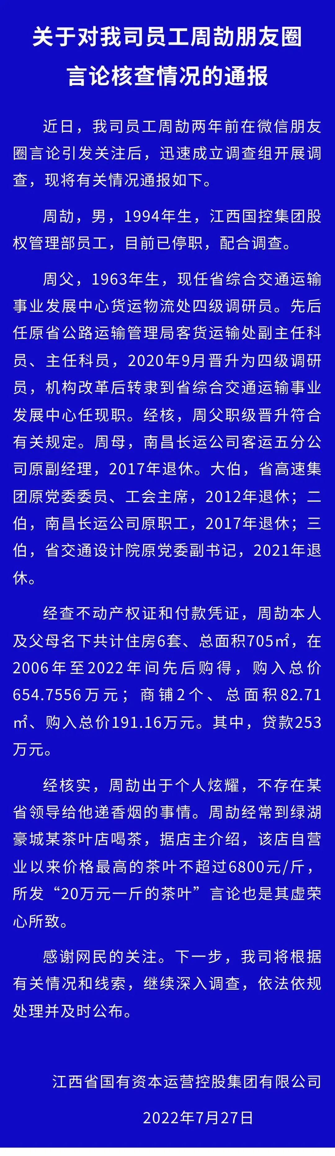 7月27日凌晨,江西省国有资本运营控股集团有限公司(简称江西国控集团)通报了对周劼朋友圈言论核查情况,宣布其已停职、配合调查。