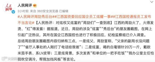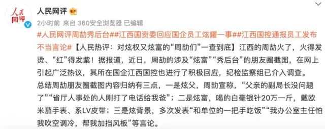 7月26日,人民网发布《人民热评:对炫权又炫富的“周劼们”一查到底》的评论文章。