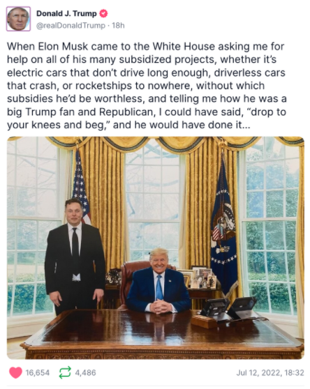 "When Elon Musk came to the White House asking me for help on all of his many subsidized projects, whether it's electric cars that don't drive long enough, driverless cars that crash, or rocketships to nowhere, without which subsidies he'd be worthless, and telling me how he was a big Trump fan and Republican, I could have said, 'drop to your knees and beg', and he would have done it."