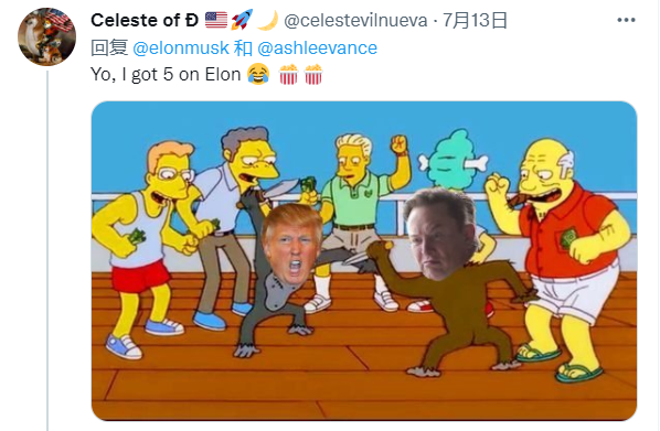 而马斯克也丝毫不示弱,迅速予以回应,并送上《辛普森一家》中“老头对天狂啸”的表情包,表示“笑掉头”。