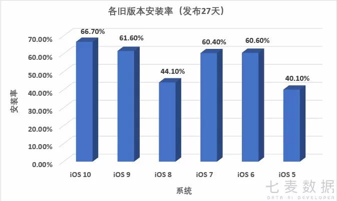 iOS 11 跟 iOS 10 及之前版本相比,安装率着实不够显眼。下图是 iOS 11 之前各系统发布后近一个月(27 天)的安装率数据: